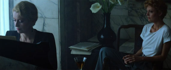 电影一开场扑面而来的是B级片之风,做作、淫邪、80年代服装造型、MTV的路数。情节相当的狗血,乃说一对男女吸血鬼,长生不老两千年,现在还唇红齿白,到夜店里勾人,上手就杀了喝血。那男的不知怎么的功力出故障,一夜白头蹬腿去了,剩下女吸血鬼一人,于是勾引了一个女医生。她用琴声把医生引到家里,诱奸,吸血,还交换了血液,医生后来想想不对头,拧巴着在嘿咻的时候自杀了。吸血鬼住那个豪华公寓阁楼上全是她前世情人们的棺材,她抱医生上去入殓。枯朽的前世情人们见她还那么楚楚动人抱着医生的尸体哭,就不爽了,男男女女干尸都跳出来,联合围攻她,把她推下楼摔死了。