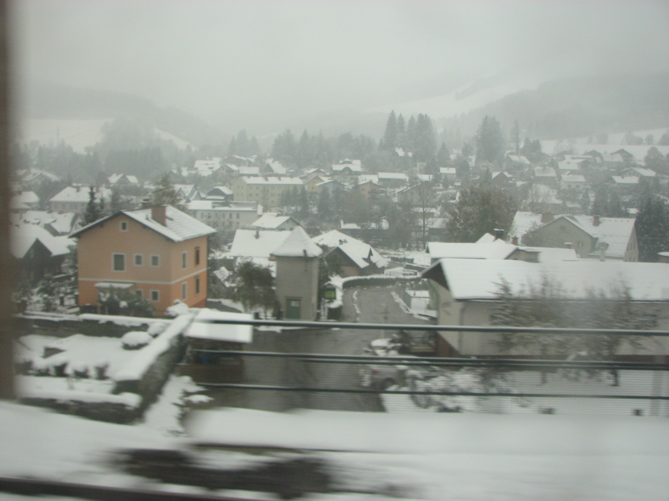 在从维也纳到威尼斯的直达列车上,雪中有安静的橙色房子带来温暖。查了查文件属性,照片摄于2009年10月17日上午8点10分。还记得吧,那天?清晨开车,经过阿尔卑斯山区风吹雪裹的村庄之后,窗外魔术似的变出了绿草如茵的田园。