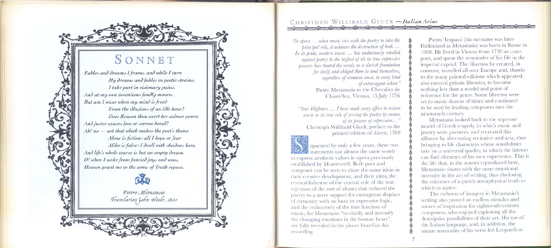 这小册子做得很用心,介绍了选曲的原则:全部取自格鲁克谱曲的梅氏剧本。在首页配上了一首梅氏的十四行诗。Claudio Osele为其写了介绍文章,题头引用了梅氏和格鲁克不同时代的信件,表达同一观念:音乐须为诗歌服务。音乐服从内容,这也是格鲁克后来的改革中一贯持的观点。我认为,他反的是夸张的、炫技的、形式凌驾于意义的正歌剧,但并不反梅氏,梅氏也一直把自己的诗放在音乐之上的: