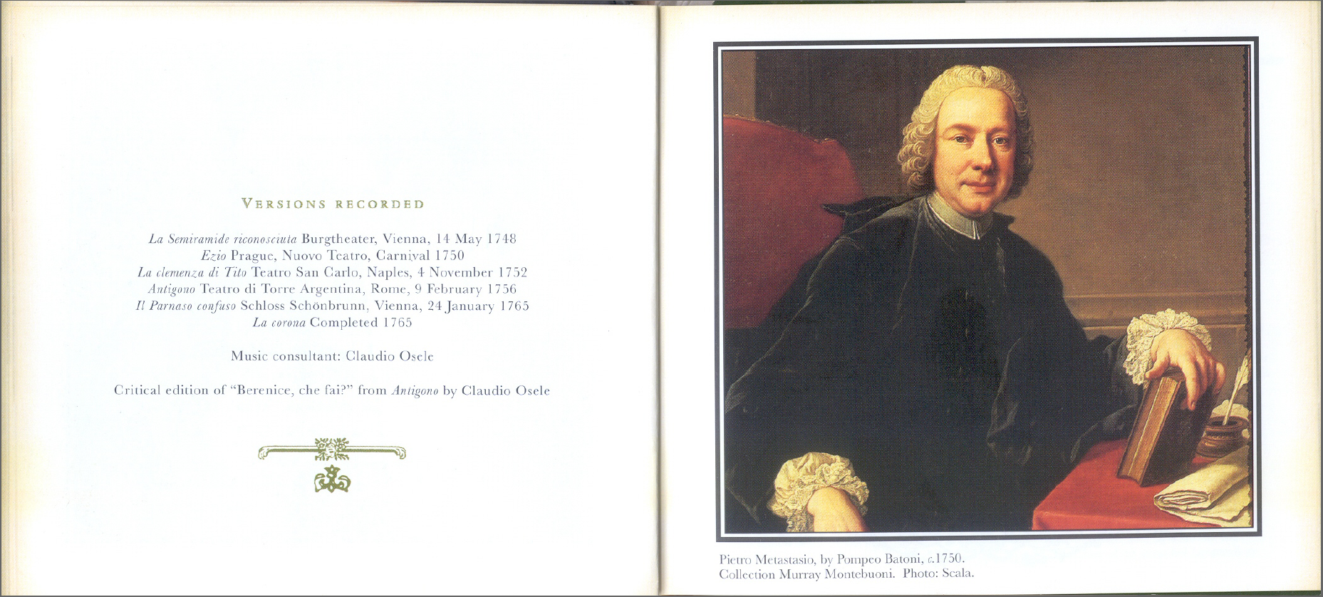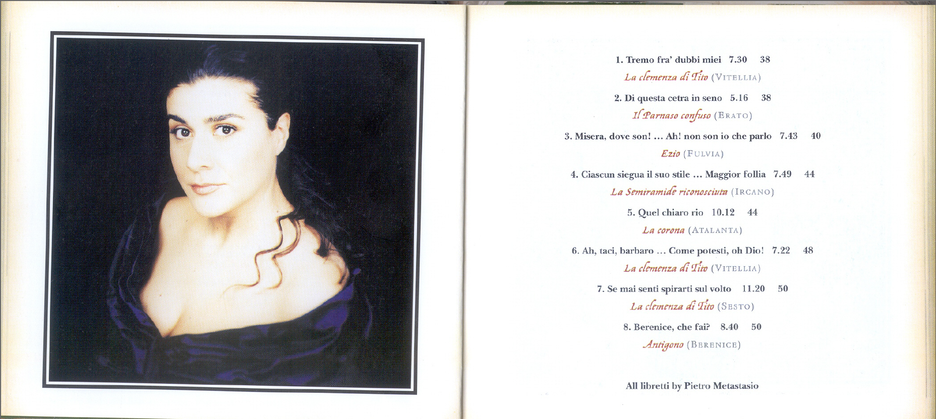 专辑所选曲目取自梅塔斯塔西奥所著,格鲁克谱曲的歌剧,包括《狄多的仁慈》、《Ezio》、《被认出的塞米拉米德》、《安提戈涅》,以及短歌剧《帕纳索山的凌乱》、《王冠》。选曲很高明,取的都是精华,各个咏叹调如不是戏剧性极强的段子,也是尽优美抒情之能事——也许编辑者(或芭托里,如果她也参与意见)认为选这样的旋律,才易于向更多的人群推广,这安排无不道理,整盘听来确实十分入耳,令人印象深刻。