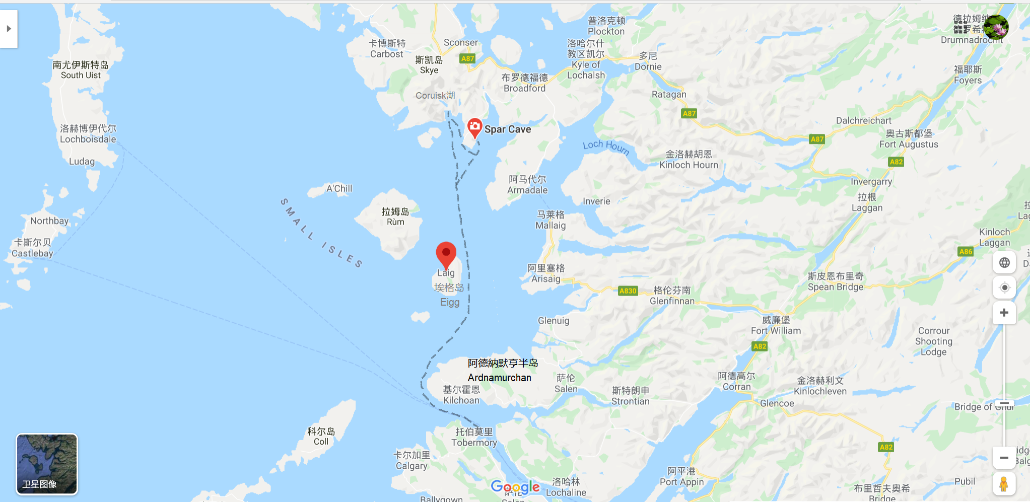 根据8月19日收到的McL小姐来信的第3页,行程摘录如下“至Scaavig湖40英里,有一淡水湖。休只知道湖的名字是Corriskin,他是这么拼的。一直不知那条溪流叫什么名字,也许根本就没名字。湖边群山环抱。从Scaavig到Slapin到山洞,只增加了3英里航程,然后返程40英里。在科尔岛有11,000亩地(记住是苏格兰亩),拉姆岛(Rum)22,000亩,Muck岛1,000亩,奎尼什6,000亩,Aros 9,000亩,Penmore 2,000亩,此即科尔的麦克林家族全部产业。”