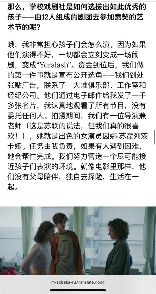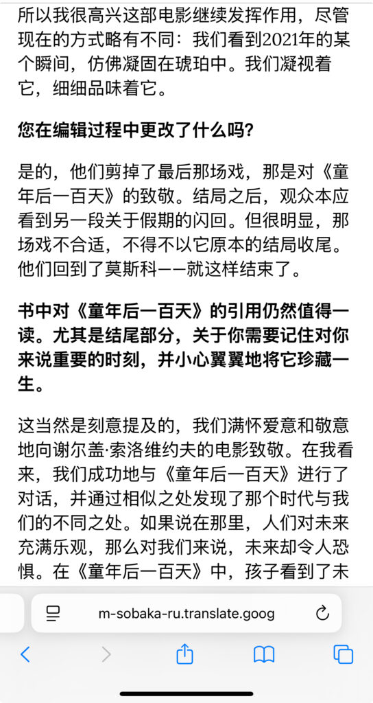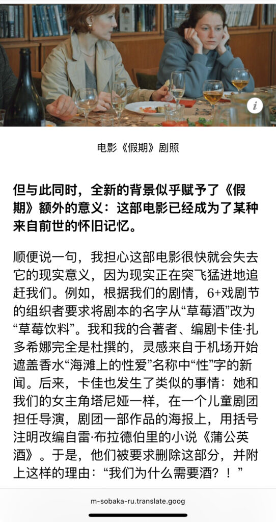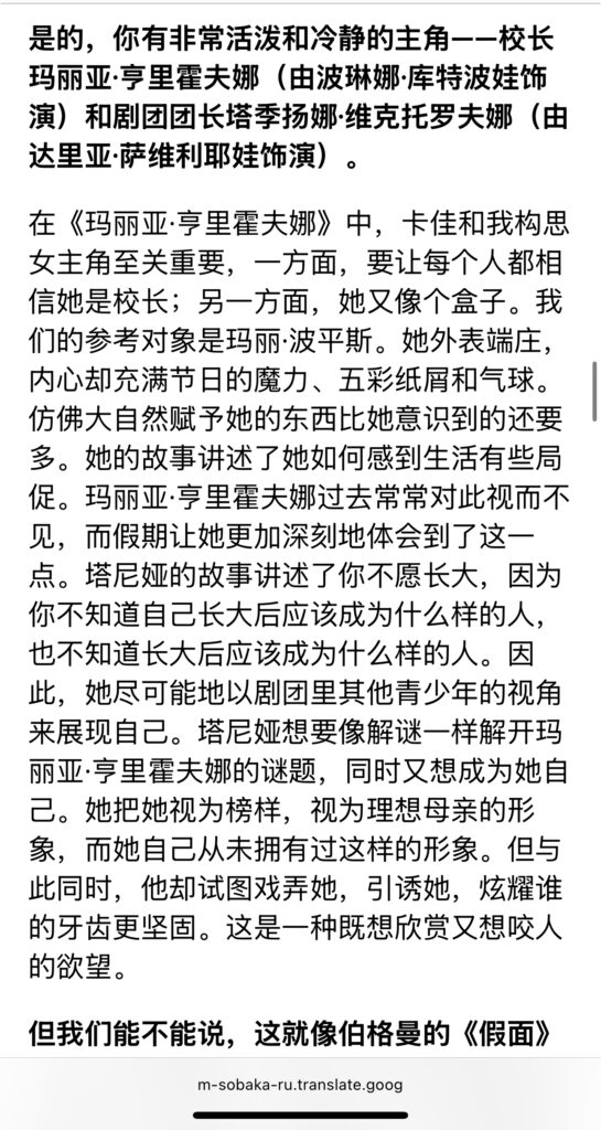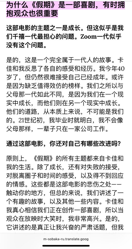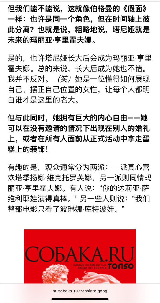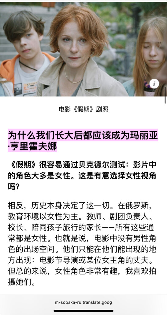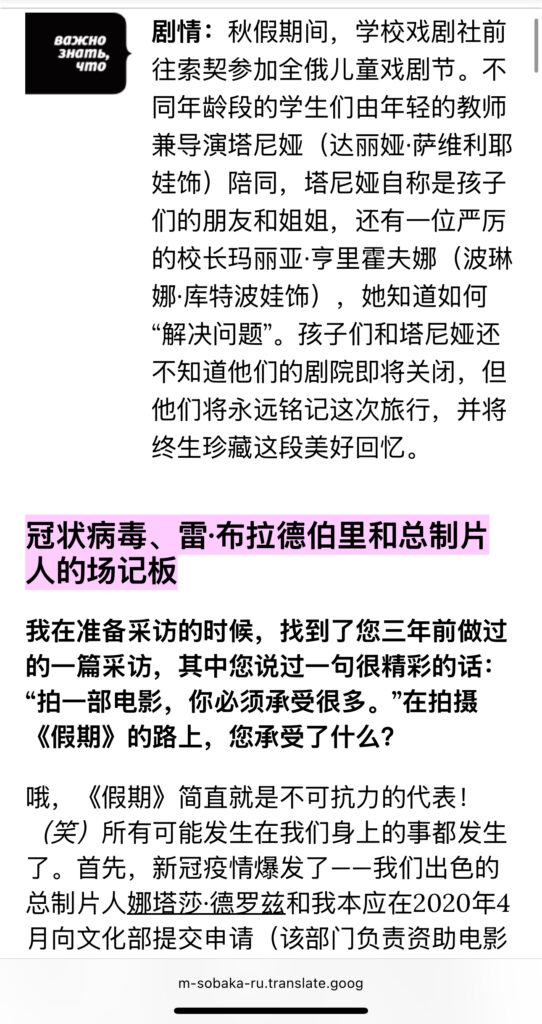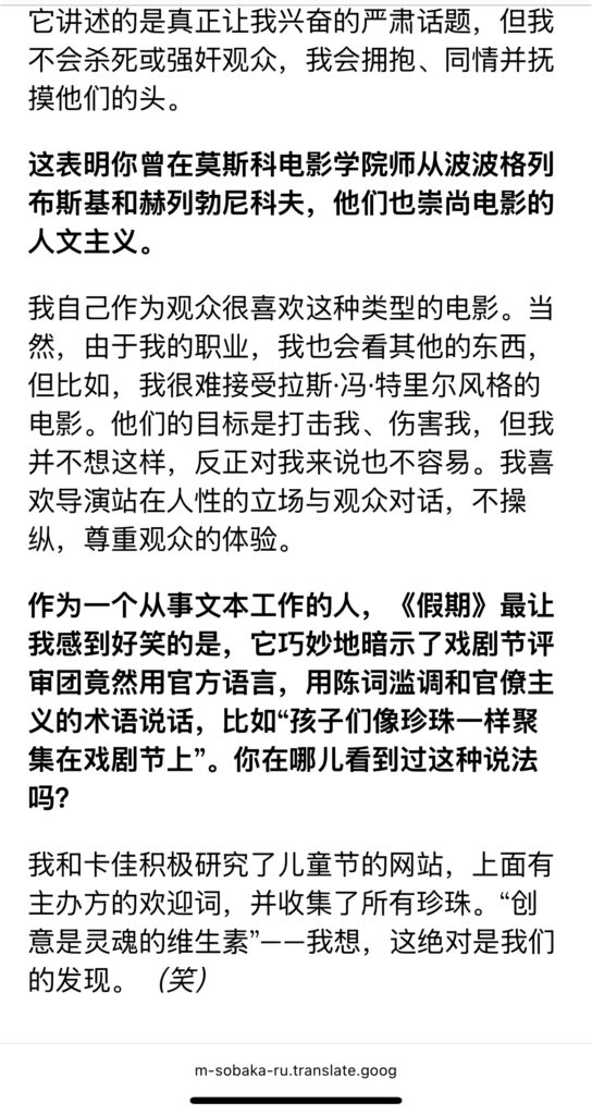 分享一篇访谈。2024年11月,《假期》在影院上映时,导演安娜·库兹涅佐娃与sobaka.ru的访谈。几个点:1 资金问题,22年开战之后,芬兰投资并没有进去,后来是制片人想方设法找到了资金。3关于三小时,制片人建议剪,结尾部分剪掉了假期回闪(图7)。3 两位主角的关系及主演的选角:先有Daria,必须找一位能凌驾她的人,于是找到了Polina,她女王一样降服了Tanya(Daria)的虚张声势。细品。