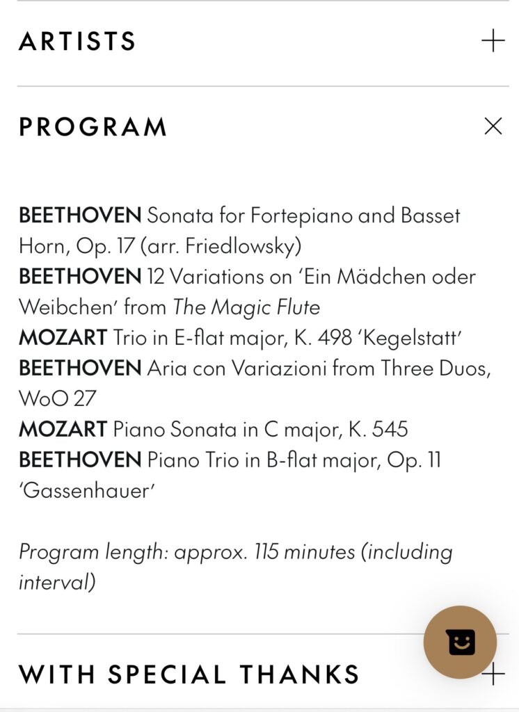 当晚演出场景非常室内、复古,入场见台上放着一架fortepiano,我心大慰。虽叫做《莫扎特的单簧管》,实际曲目来自贝多芬多于莫扎特,略出乎意外的是,并没有莫扎特单簧管曲目中最热门的K622。演奏者们似乎更注重还原历史演出,而不是please大众。