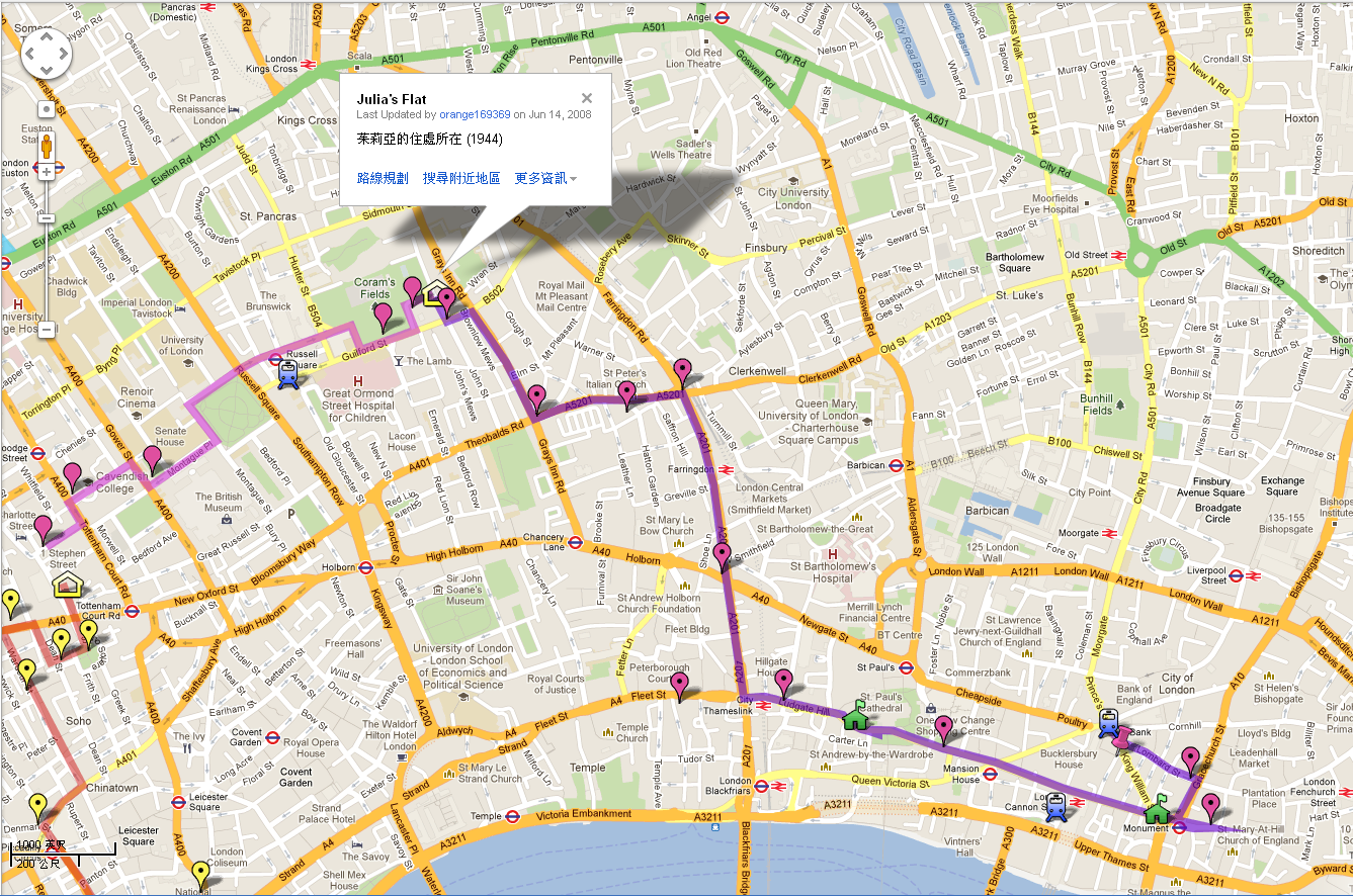 老师对伦敦街道地标如数家珍,隔不了几页就来一次,脑子里没印象是不行的。所幸,有位Sarah Waters同好居然做了一个地图,真乃醒神定位利器。